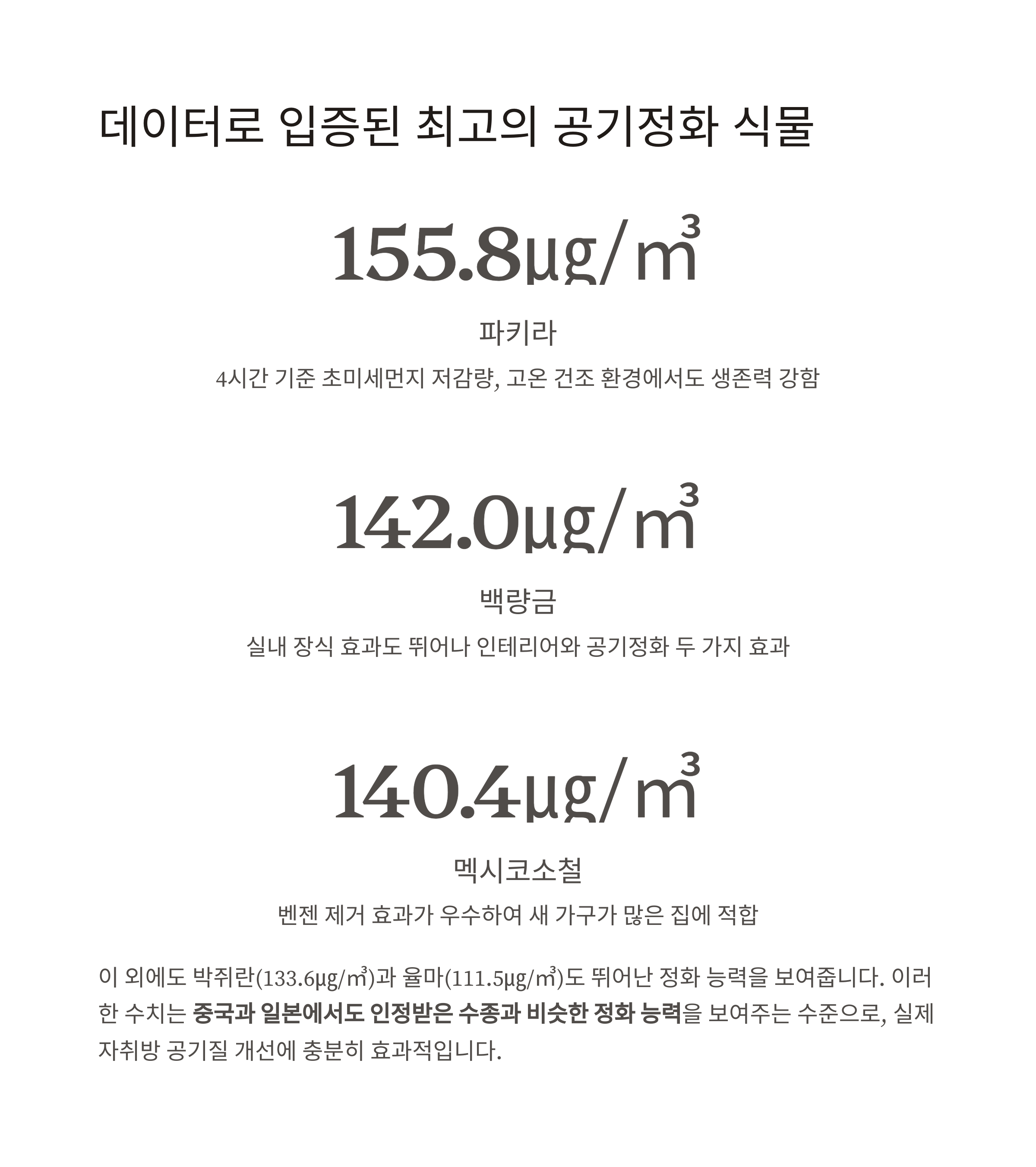 이러한 수치는 중국과 일본에서도 인정받은 수종과 비슷한 정화 능력을 보여주는 수준이며,