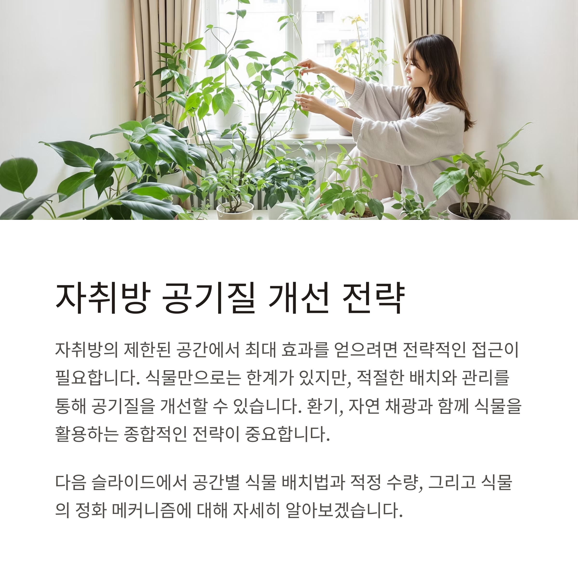 3~5개 식물, 적절한 환기, 자연 채광, 공기청정기와의 조합이 함께 이뤄져야