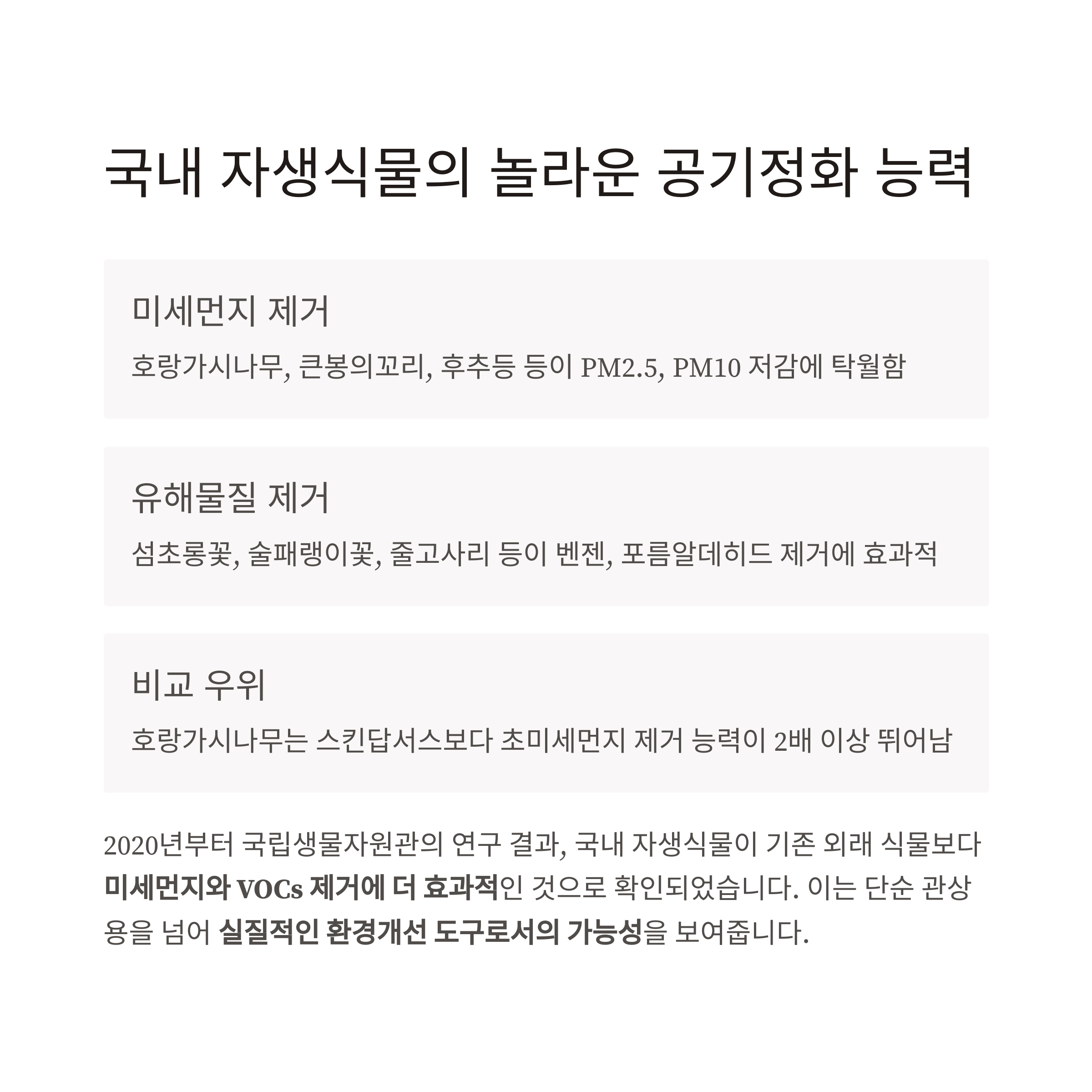 특히 최근 주목받고 있는 자생식물 기반 공기정화 전략