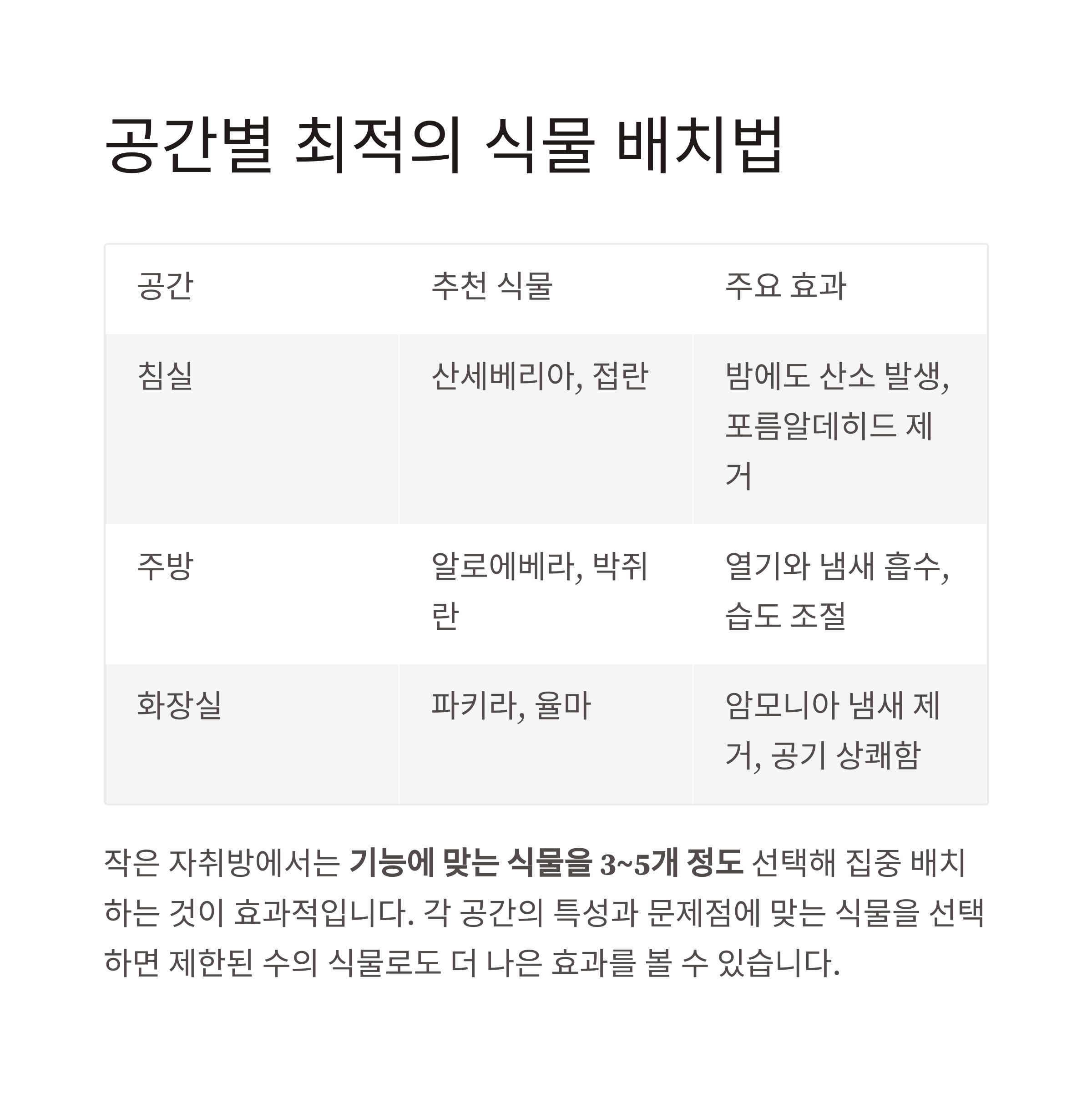 작은 공간일수록 기능에 맞는 식물을 3~5개 정도 선택해 집중 배치해야 효과가 큽니다.