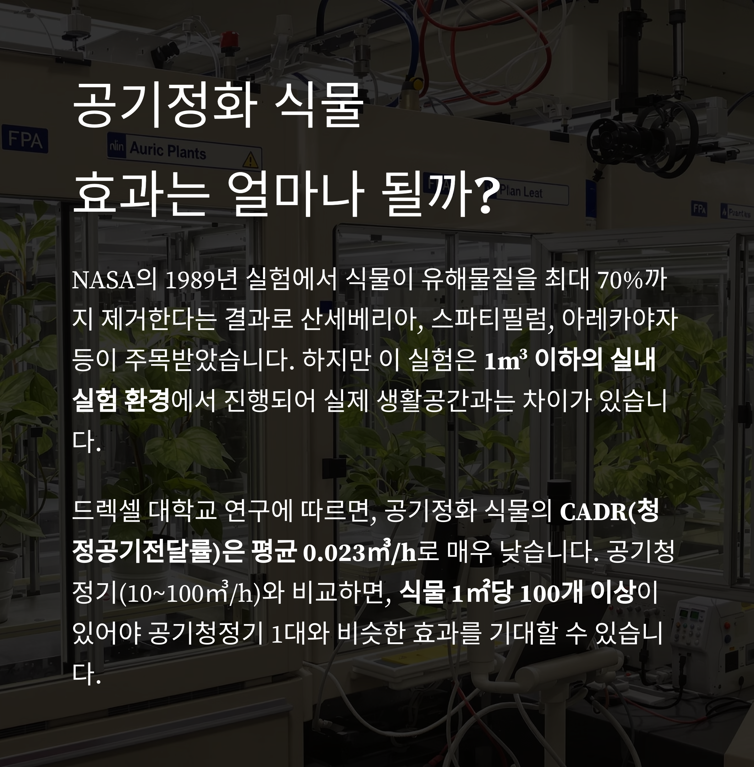 드렉셀 대학교의 연구에 따르면, 공기정화 식물의 CADR(청정공기전달률)은 평균 0.023㎥/h로 매우 낮습니다.