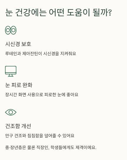 | 루테인·제아잔틴 | 눈 건강, 시신경 보호 |