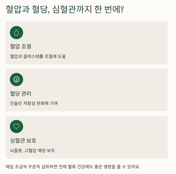 심장과 혈관의 부담을 줄이고 뇌졸중, 고혈압 같은 질환의 예방을 돕는 보조 식품으로도 활용됩니다.