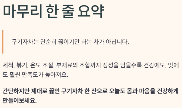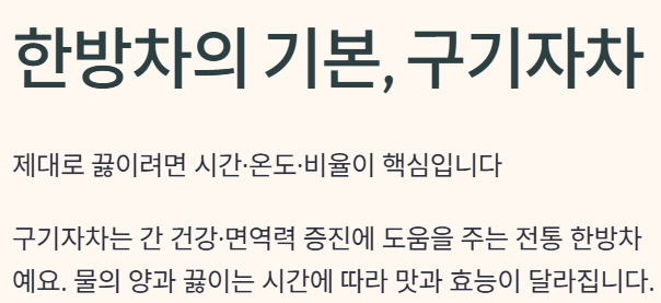 | 맛 향상 팁 | 구기자 볶기, 대추·감초 활용, 티백 우림 시간 조절 등 |