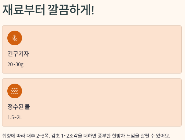 | 기본 재료 | 건구기자 20~30g + 물 1.5~2L |