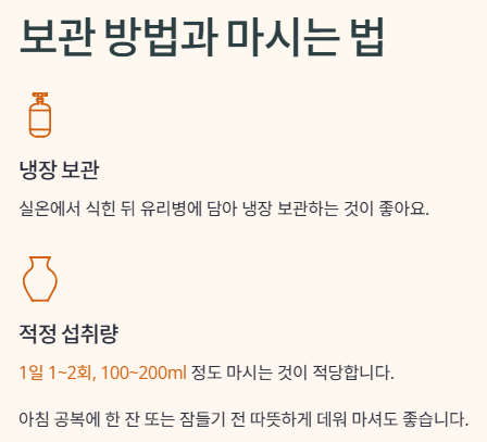 유리병에 담아 두고 1일 1~2회, 100~200ml 정도 마시는 것이 적당합니다.
