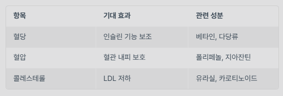 - 혈압·혈당을 낮추는 방향으로 작용하기 때문에