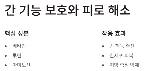 | 간 기능 개선 | 지방간·간염 개선 보조, 간 수치 안정화 |