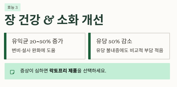 유익균이 20~50% 증가했다는 보고가 있으며 변비·설사 완화에 도움이 될 수 있습니다.