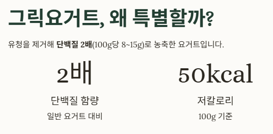 100g 기준 단백질 8~15g으로 일반 요거트(3~5g)보다 훨씬 높습니다.