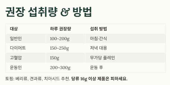 하지만 첨가당 제품은 혈당과 체중 증가 위험이 있으므로 반드시 무가당 플레인 제품 선택이 중요합니다.