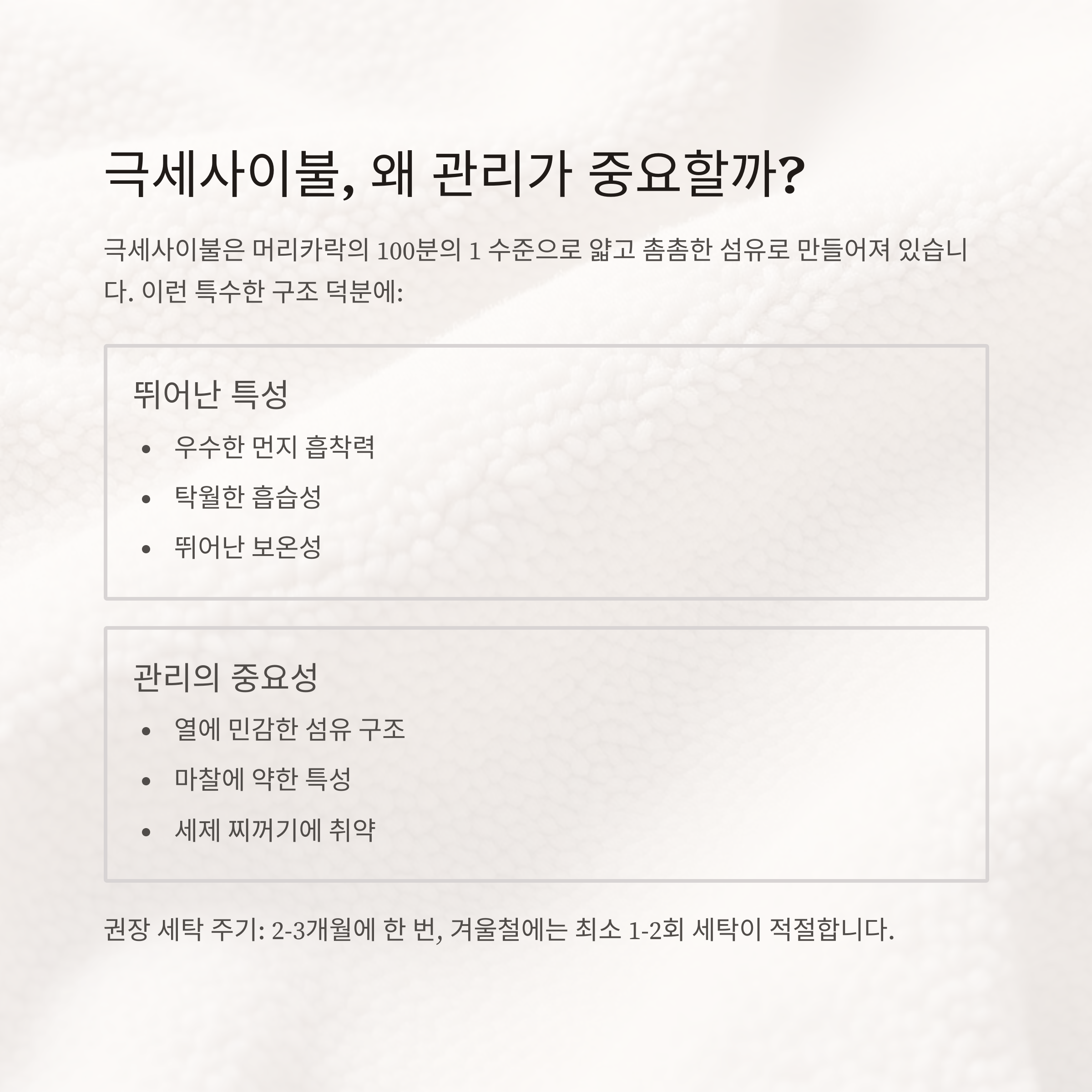 극세사이불은 머리카락의 100분의 1 수준으로 얇고 촘촘한 섬유가 먼지를 쉽게 끌어당기고, 흡습성과 보온성이 뛰어나 겨울철 필수 아이템입니다. 하지만 섬유가 워낙 가늘고 조밀해 열과 마찰, 세제 찌꺼기에 매우 민감해 관리가 까다롭습니다. 올바른 세탁법을 지키지 않으면 촉감이 거칠어지고 보온력이 떨어질 수 있기 때문에 반드시 권장 세탁법을 따르는 것이 중요합니다. 권장 세탁 주기는 2~3개월에 한 번, 겨울철에는 최소 1~2회이며, 평소에는 먼지를 털고 햇볕 건조를 병행하는 것이 좋습니다.