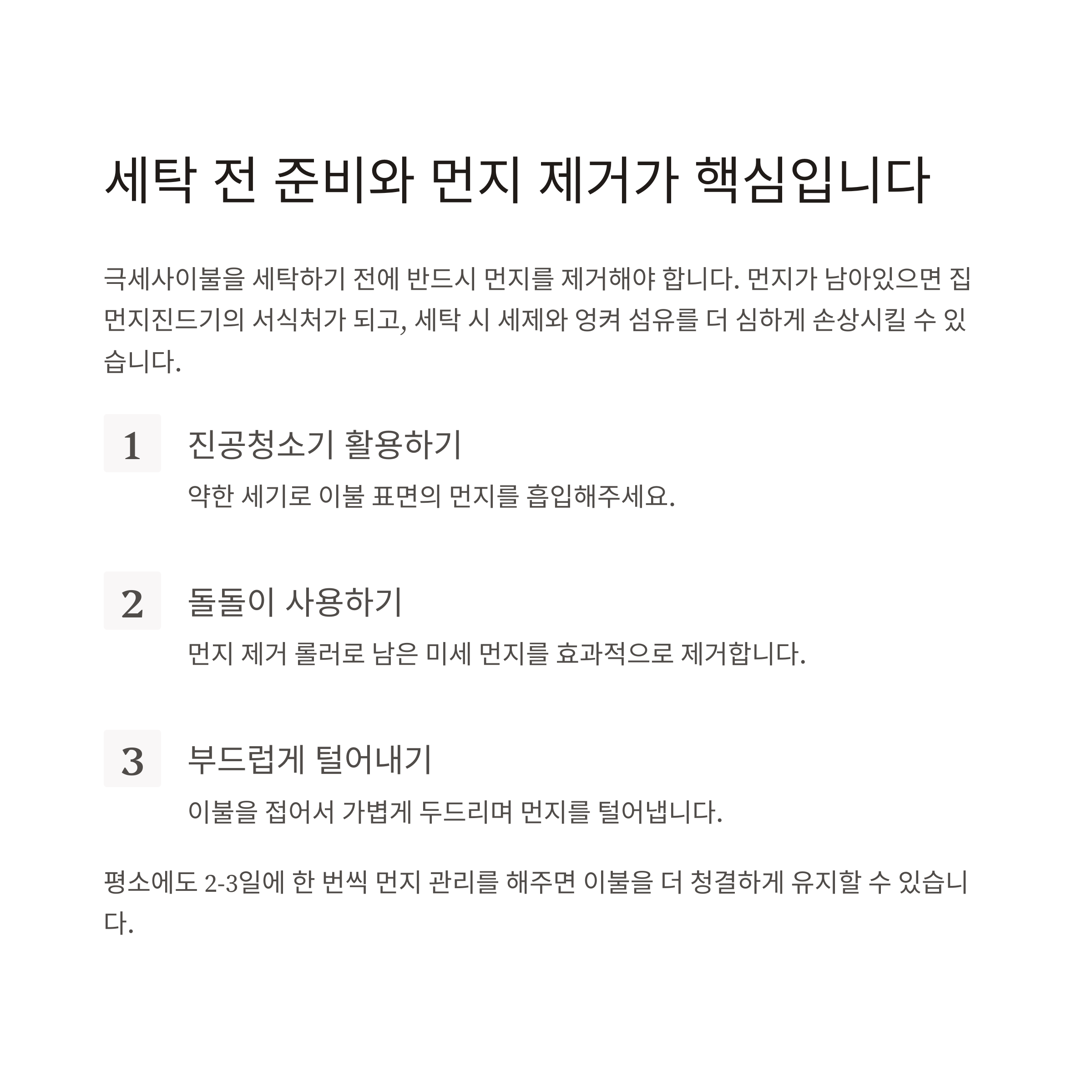 세탁 전 준비와 먼지 제거가 핵심입니다