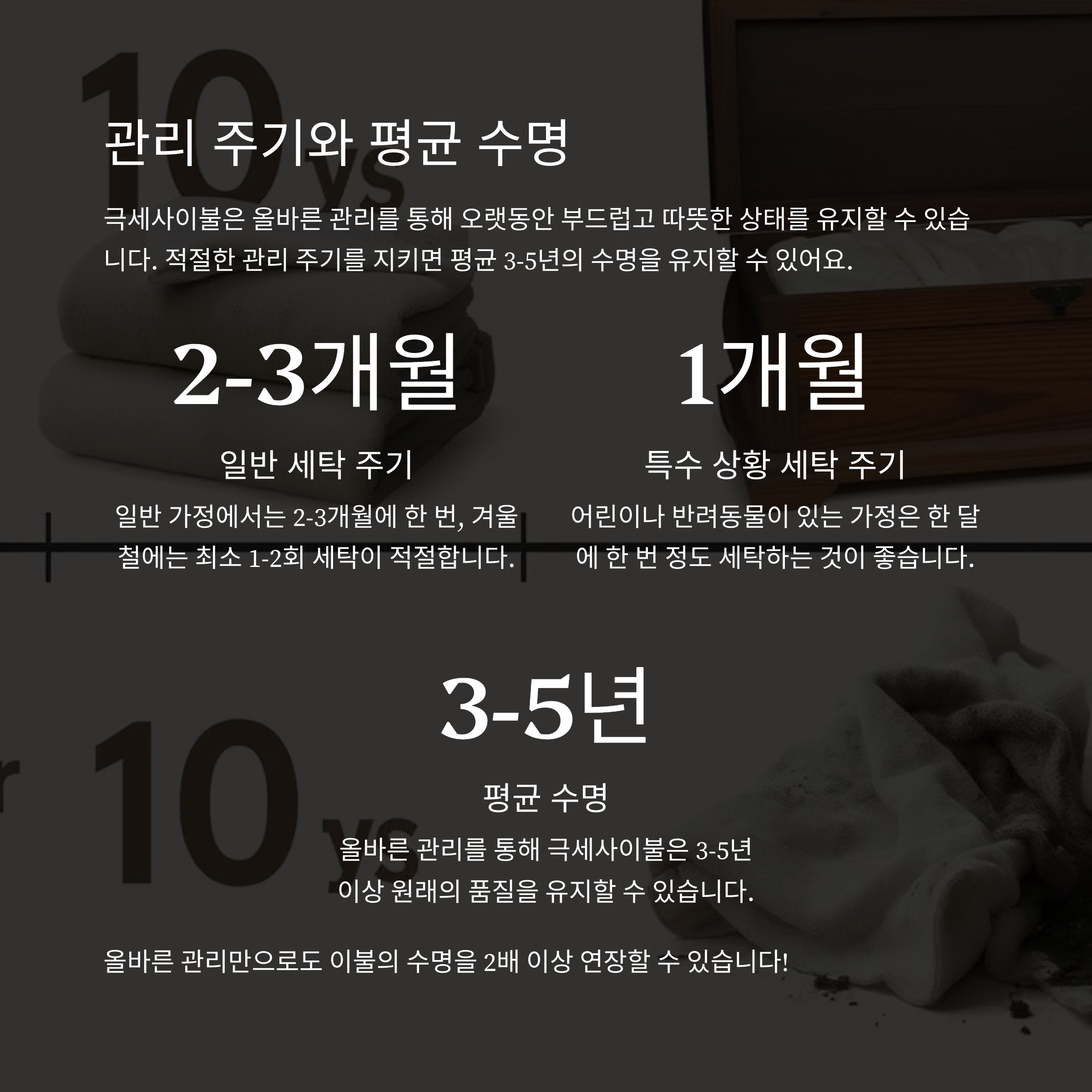 극세사이불은 주기적인 관리와 올바른 세탁만으로도 3~5년 이상 부드럽고 따뜻한 상태를 유지할 수 있습니다.