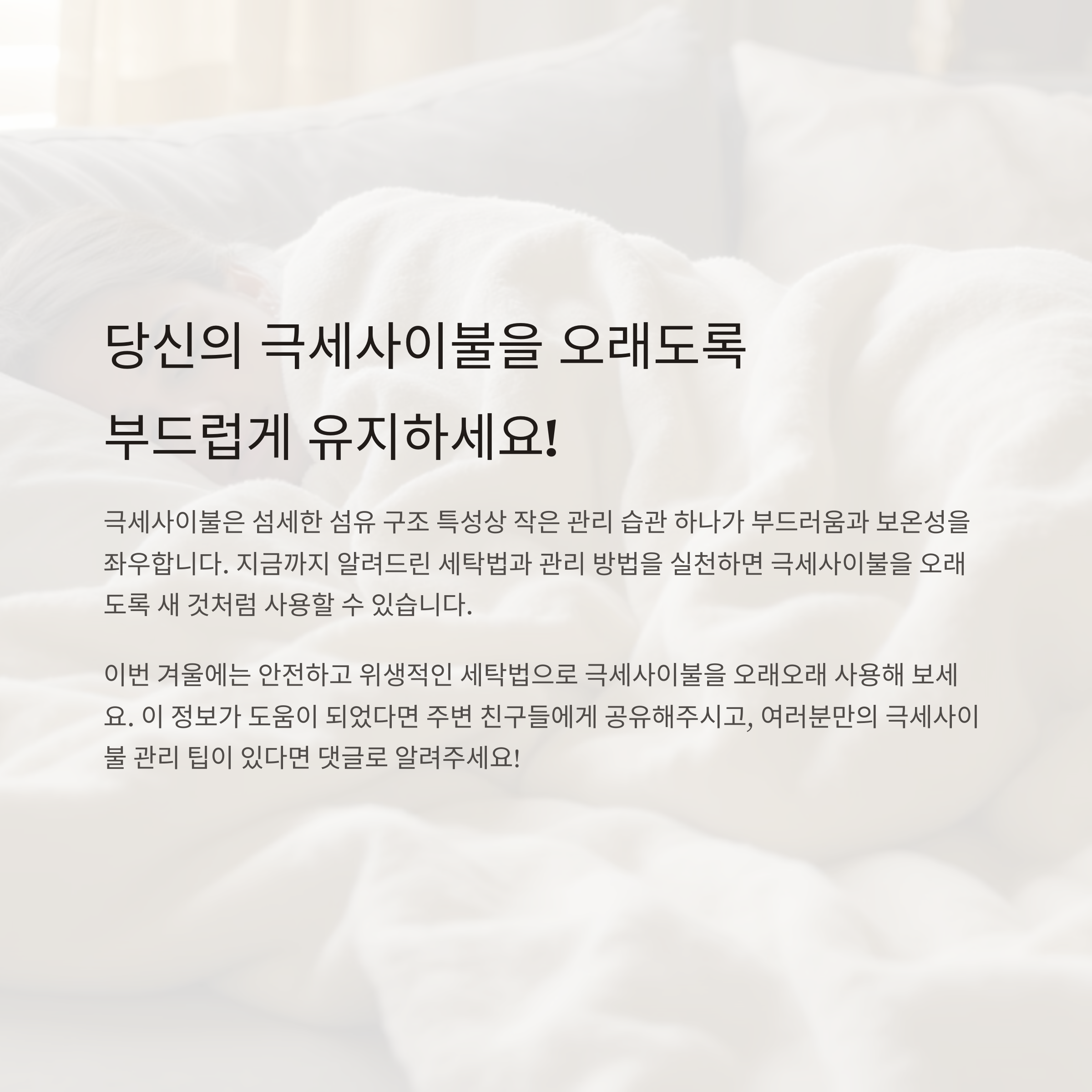 극세사이불은 섬세한 섬유 구조 특성상 작은 관리 습관 하나가 부드러움과 보온성을 좌우합니다. 이번 겨울에는 안전하고 위생적인 세탁법으로 극세사이불을 오래오래 사용해 보세요.