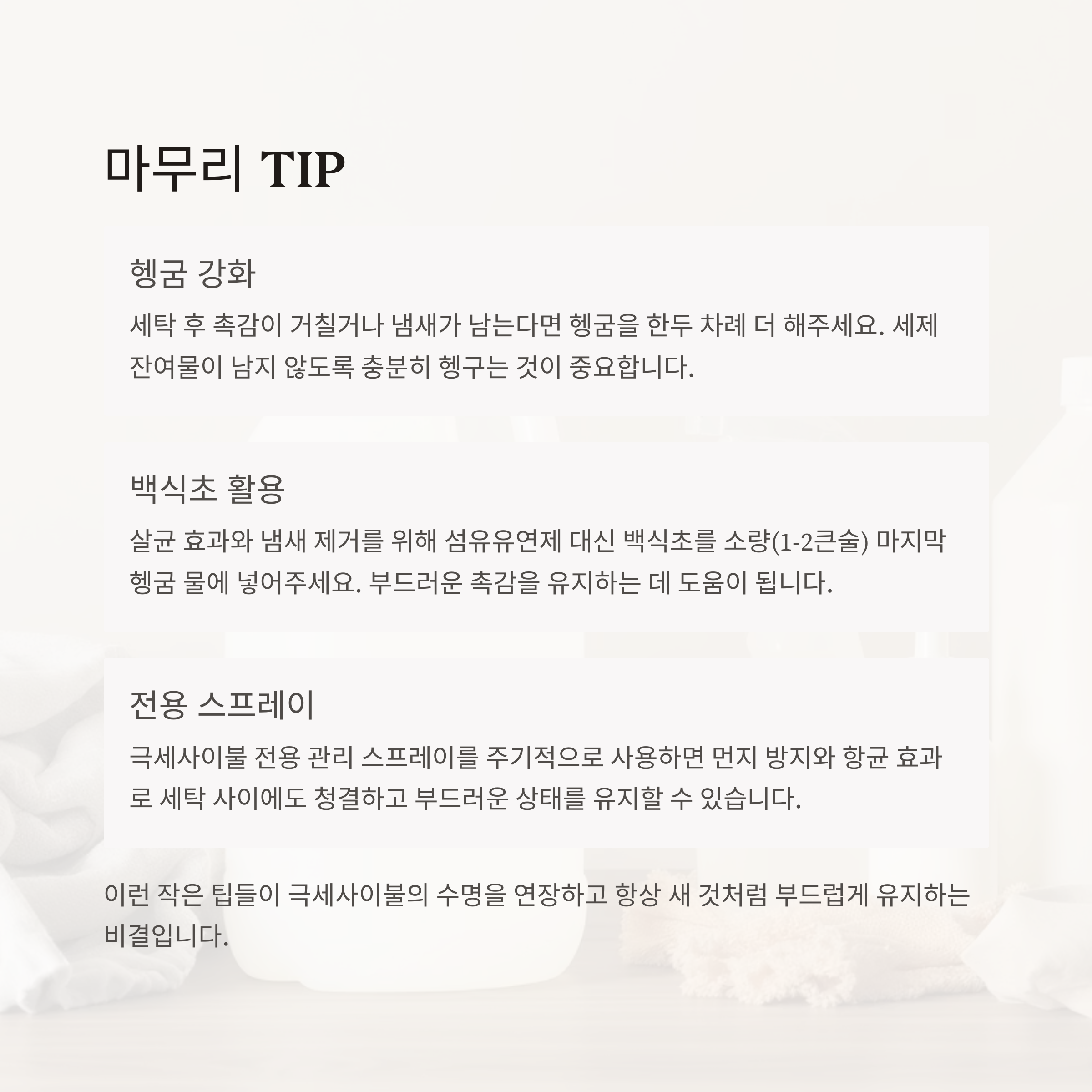 헹굼 후 촉감이 거칠거나 냄새가 남는다면 헹굼을 한두 차례 더 해주세요. 살균 효과와 냄새 제거를 위해 섬유유연제 대신 백식초를 소량 넣어도 좋습니다. 극세사이불 전용 관리 스프레이를 병행하면 사용 기간 동안 청결하고 부드러운 촉감을 오래 유지할 수 있습니다.