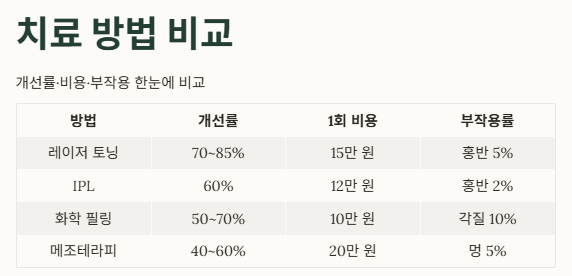 2. 기미 치료 방법 비교 (개선률·비용·부작용)