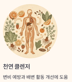 변비가 자주 발생하거나 장내 독소 배출이 필요한 분들에게는 천연 클렌저 역할을 해줄 수 있죠.