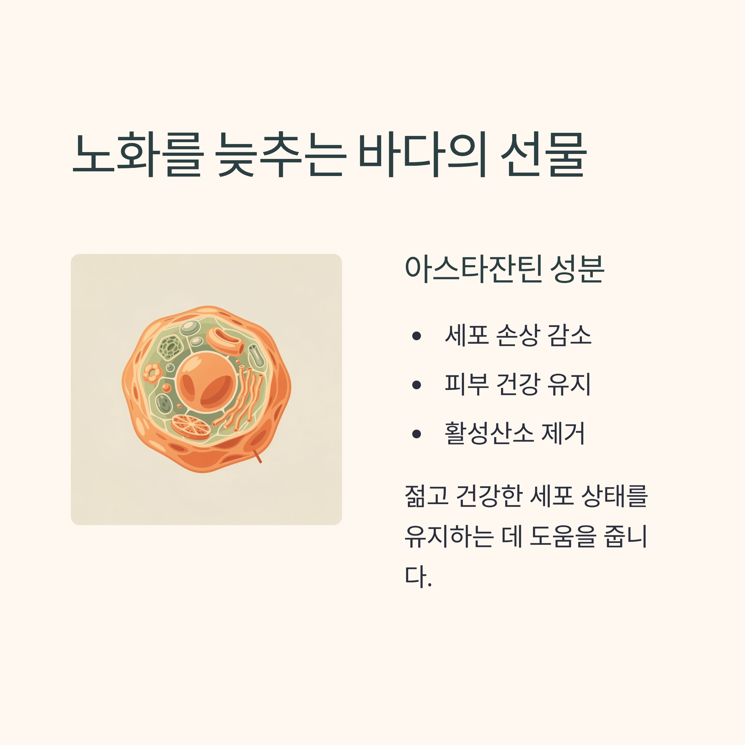 특히 '아스타잔틴'이라는 성분은 세포 손상을 줄이고 피부 건강 유지에도 긍정적인 영향을 줍니다.