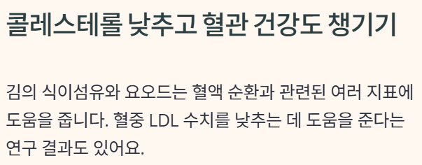 김의 식이섬유와 요오드는 혈액 순환과 관련된 여러 지표에 도움을 줍니다.
