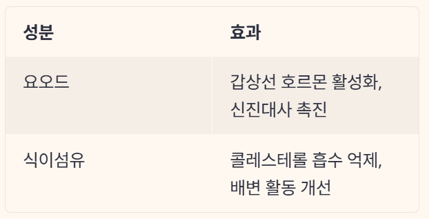 혈중 LDL 수치를 낮추는 데 도움을 준다는 연구 결과도 있으며, 갑상선 기능을 활성화해 신진대사를 촉진시키는 데 효과적입니다.
