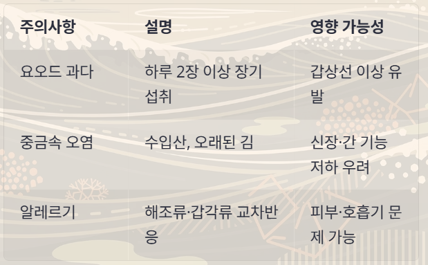 | 요오드 과다 | 하루 2장 이상 장기 섭취 | 갑상선 이상 유발 |