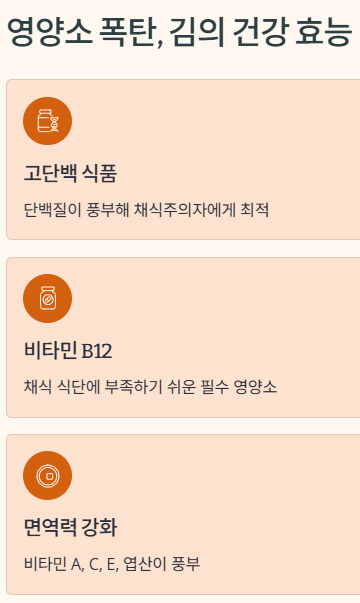 김은 단백질은 물론 비타민과 미네랄, 항산화 성분까지 두루 갖춘 고영양 식품입니다. 특히 비타민 B12 함량이 높아 채식 위주의 식단을 지향하는 분들에게 유익하죠.