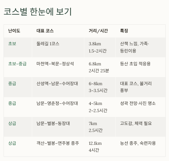 • 특징: 오르막·내리막이 반복되며, 수어장대에서 보는 전경이 일품. 적당한 운동량과 역사 탐방을 함께 즐길 수 있어요.