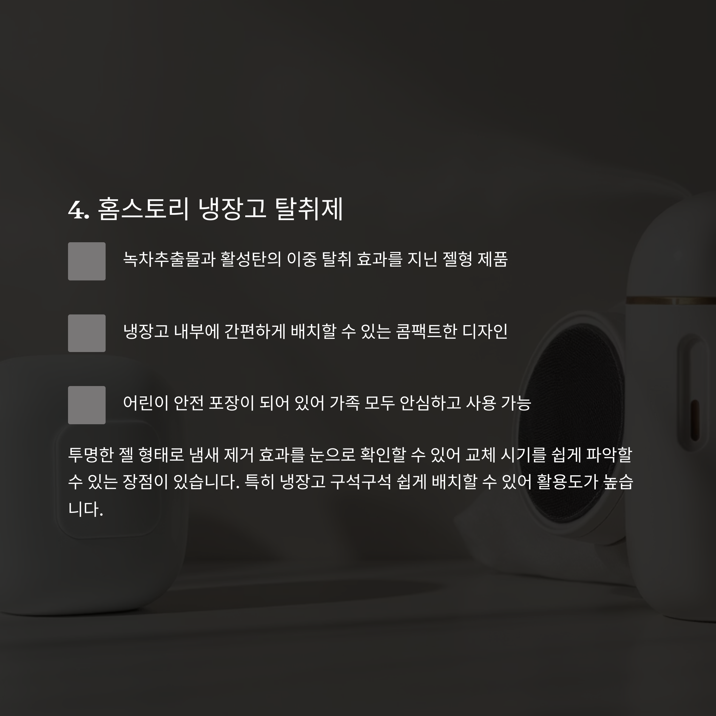 작은 크기로 구석에도 쏙 들어가면서도 탈취력이 강해 인기입니다. 김치냄새와 반찬냄새 제거에 특히 좋고, 반복 구매율이 높아 만족도가 높은 제품입니다.