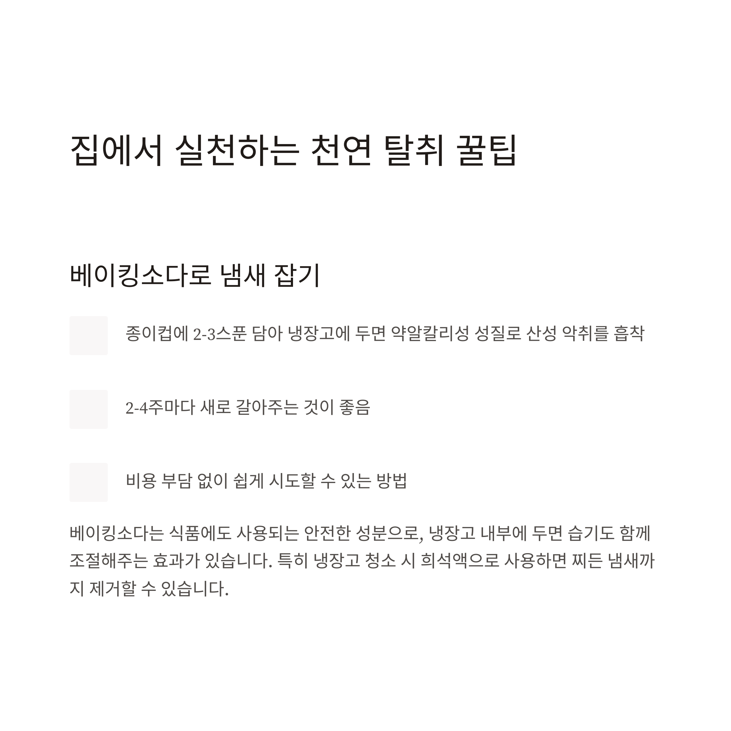 종이컵에 2~3스푼 담아 냉장고에 두면 약알칼리성 성질로 산성 악취를 흡착해 줍니다. 2~4주마다 새로 갈아주는 것이 좋습니다.