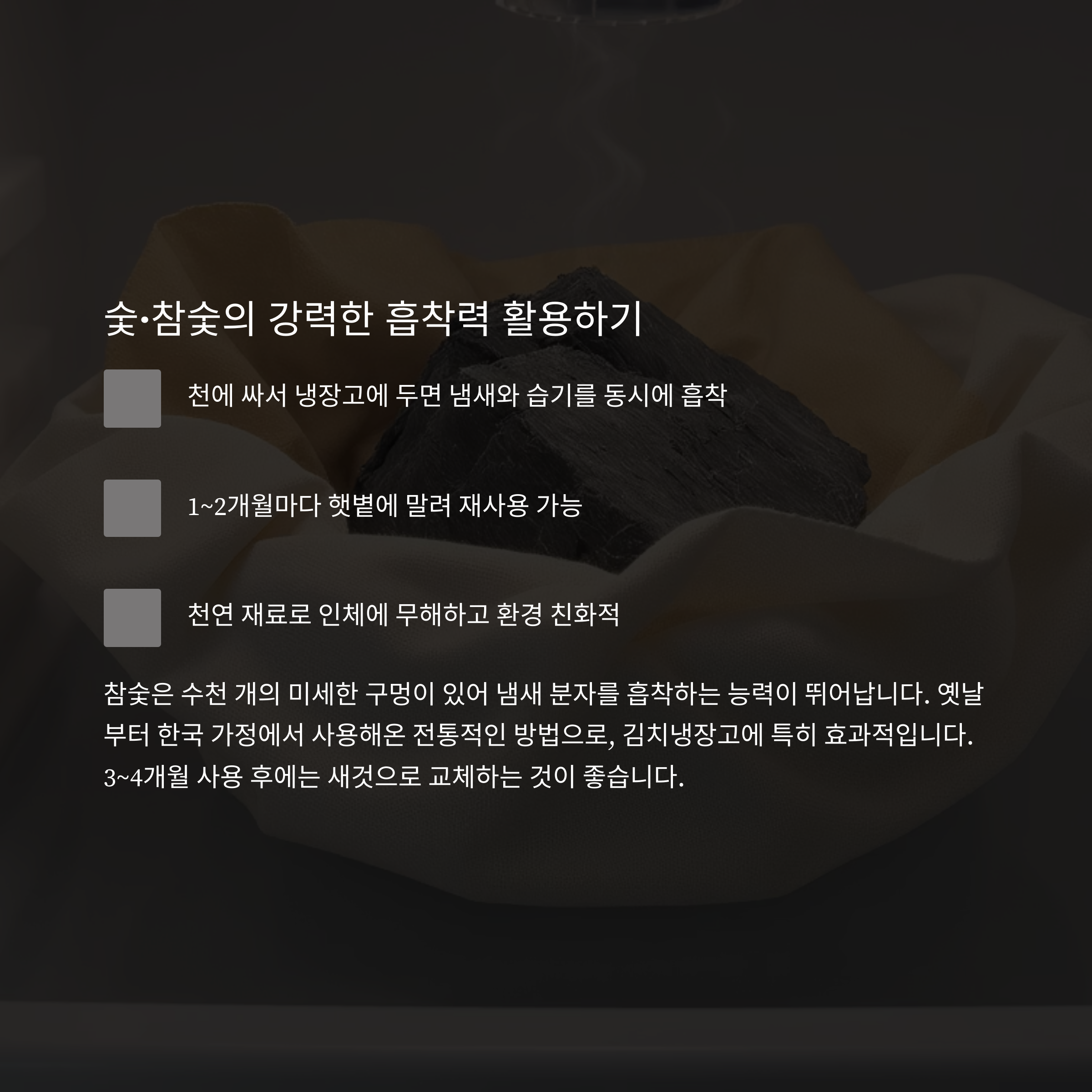 천에 싸서 냉장고에 두면 냄새와 습기를 동시에 흡착하며 1~2개월마다 햇볕에 말려 재사용할 수 있습니다.