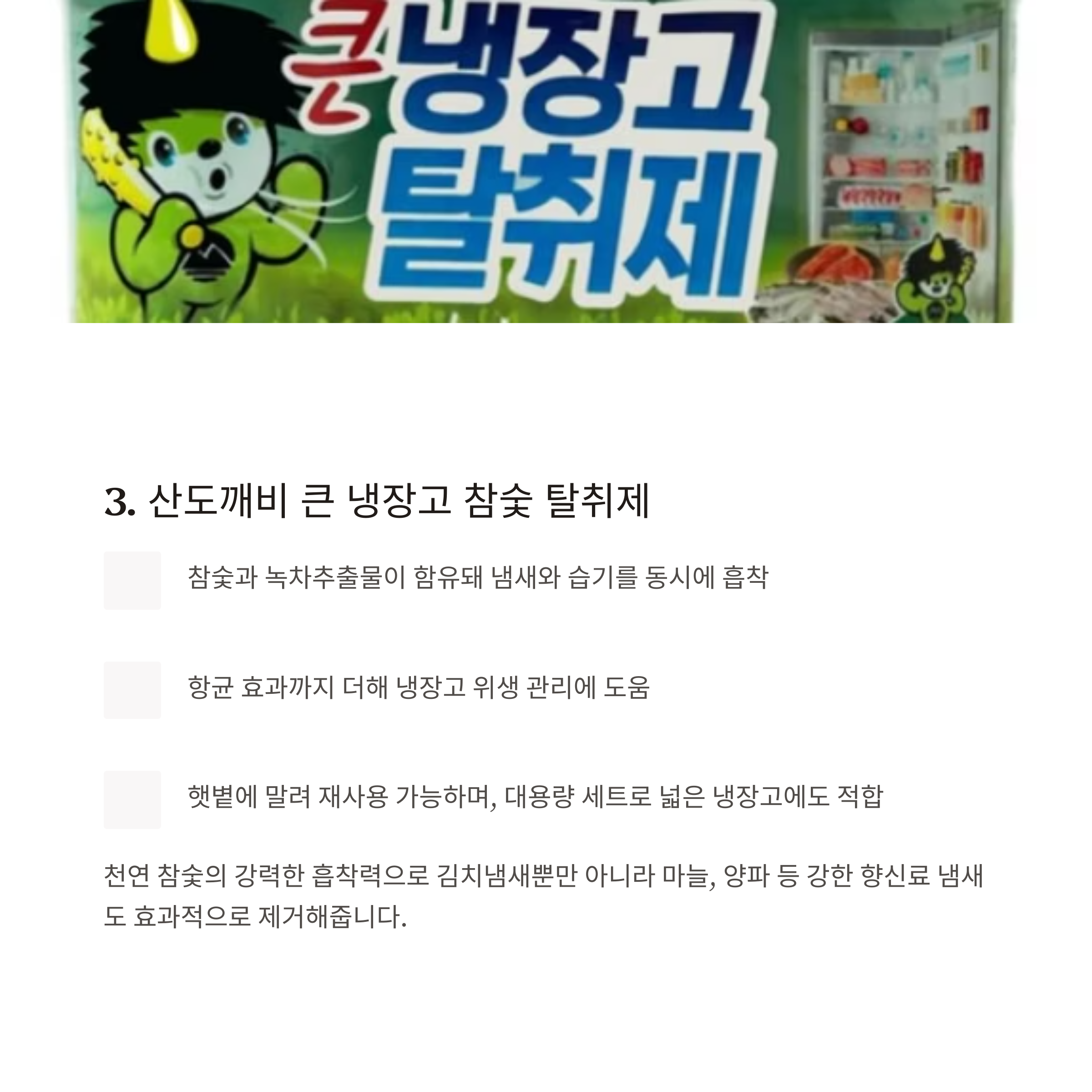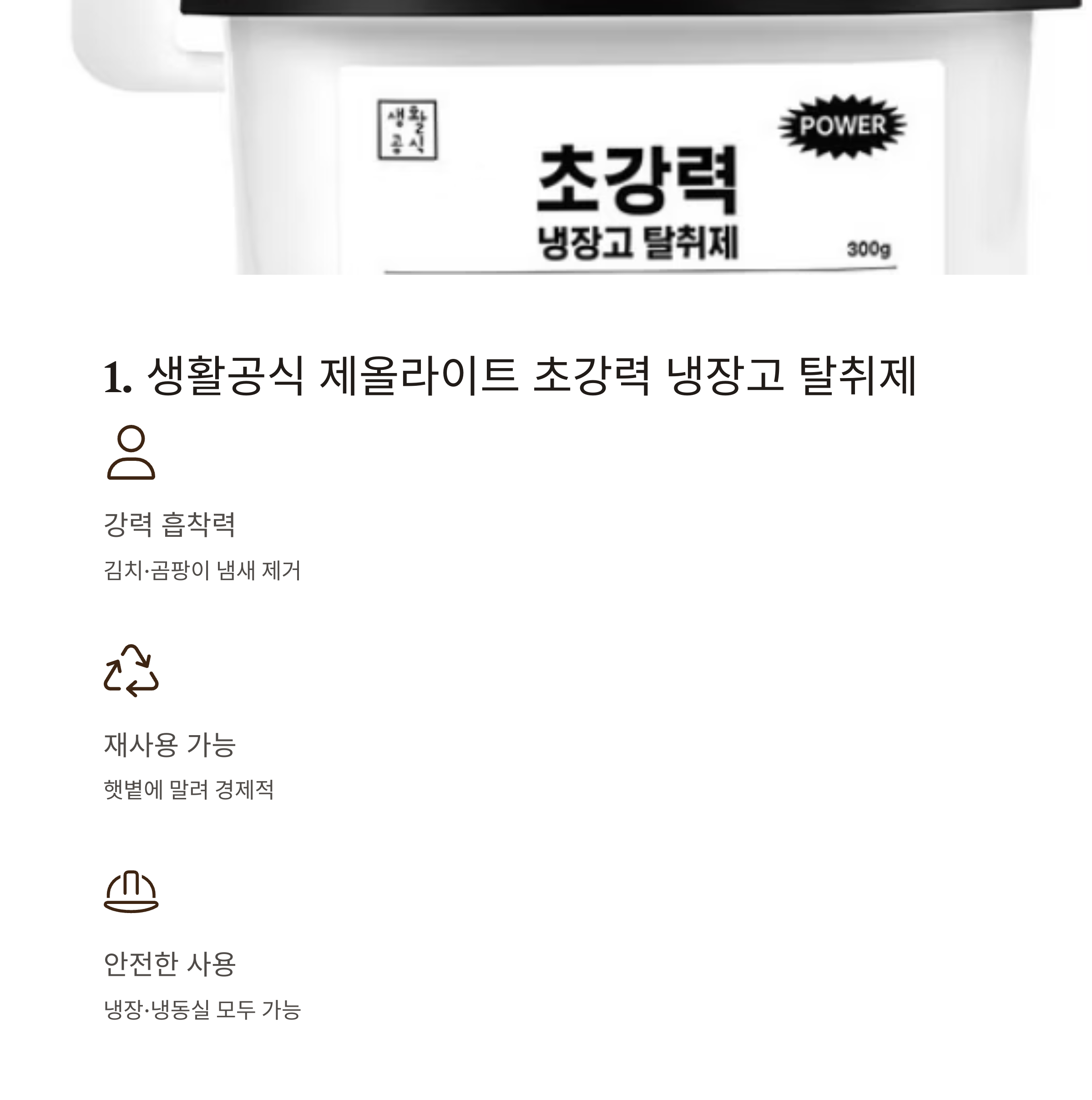 작은 크기로 구석에도 쏙 들어가면서도 탈취력이 강해 인기입니다. 김치냄새와 반찬냄새 제거에 특히 좋고, 반복 구매율이 높아 만족도가 높은 제품입니다.