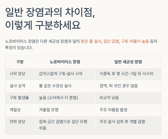 | 구분 | 노로바이러스 장염 | 일반 세균성 장염 |