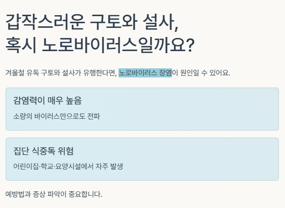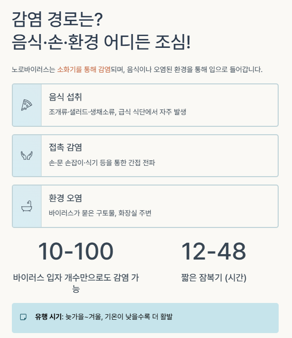 이 질환은 감염력이 매우 높아 소량의 바이러스만으로도 전파되고, 집단 식중독으로 번지기 쉬운 특징이 있어요.