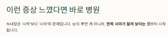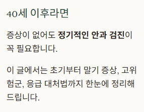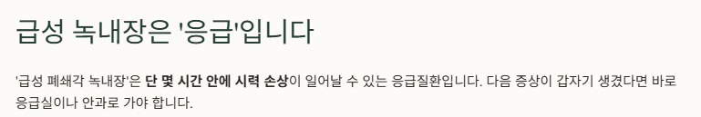 | 눈 충혈, 시력 급격 저하 | 눈이 뻑뻑하고 시력 떨어짐 |