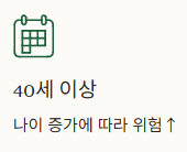 | 40세 이상 | 나이 증가에 따라 위험↑ |