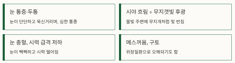 - 눈 통증·두통·무지갯빛 후광과 구토가 함께 온다(급성 의심)