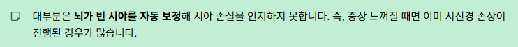 대부분은 뇌가 빈 시야를 자동 보정해 시야 손실을 인지하지 못합니다.