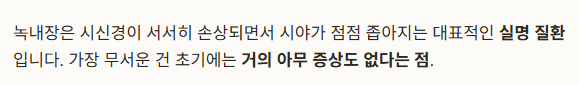 가장 무서운 건 초기에는 거의 아무 증상도 없다는 점. 한쪽 시야가 잘 안 보이기 시작하거나, 계단·문틀에 자꾸 부딪힌다?
