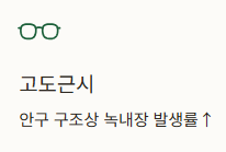 | 고도근시 | 안구 구조상 녹내장 발생률↑ |