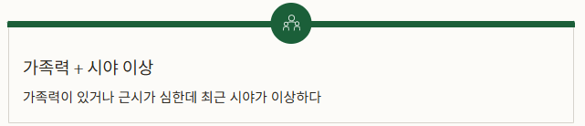 | 녹내장 가족력 | 유전성, 발병률 3~4배 |