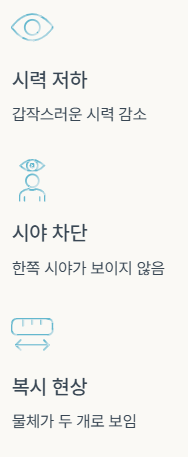 시력이 갑자기 나빠지거나, 시야의 일부가 보이지 않는 증상, 복시(물체가 두 개로 보임)가 나타날 수 있습니다.