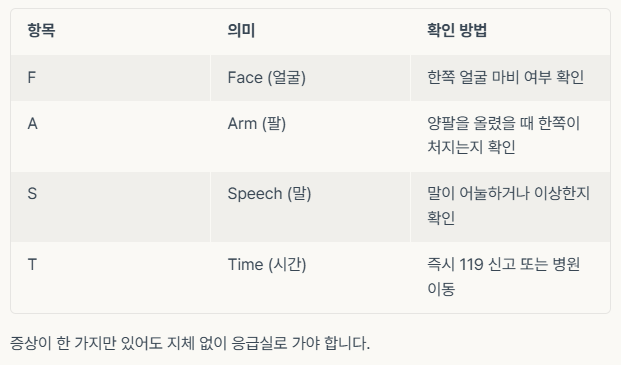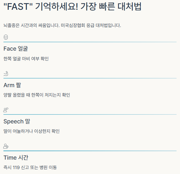 뇌졸중은 시간과의 싸움입니다. 미국심장협회가 제시한 응급 대처법 "FAST"는 다음과 같습니다.