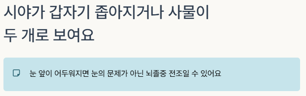 증상이 한 가지만 있어도 지체 없이 응급실로 가야 하며, 병원까지의 이송 시간은 생존율과 후유증 경과를 좌우하는 중요한 요소입니다.