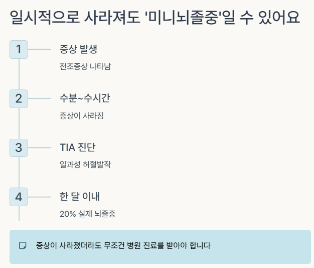 뇌졸중 전조증상이 수분에서 수시간 안에 사라진다면, 이를 일과성 허혈발작(TIA) 혹은 미니뇌졸중이라 부릅니다.