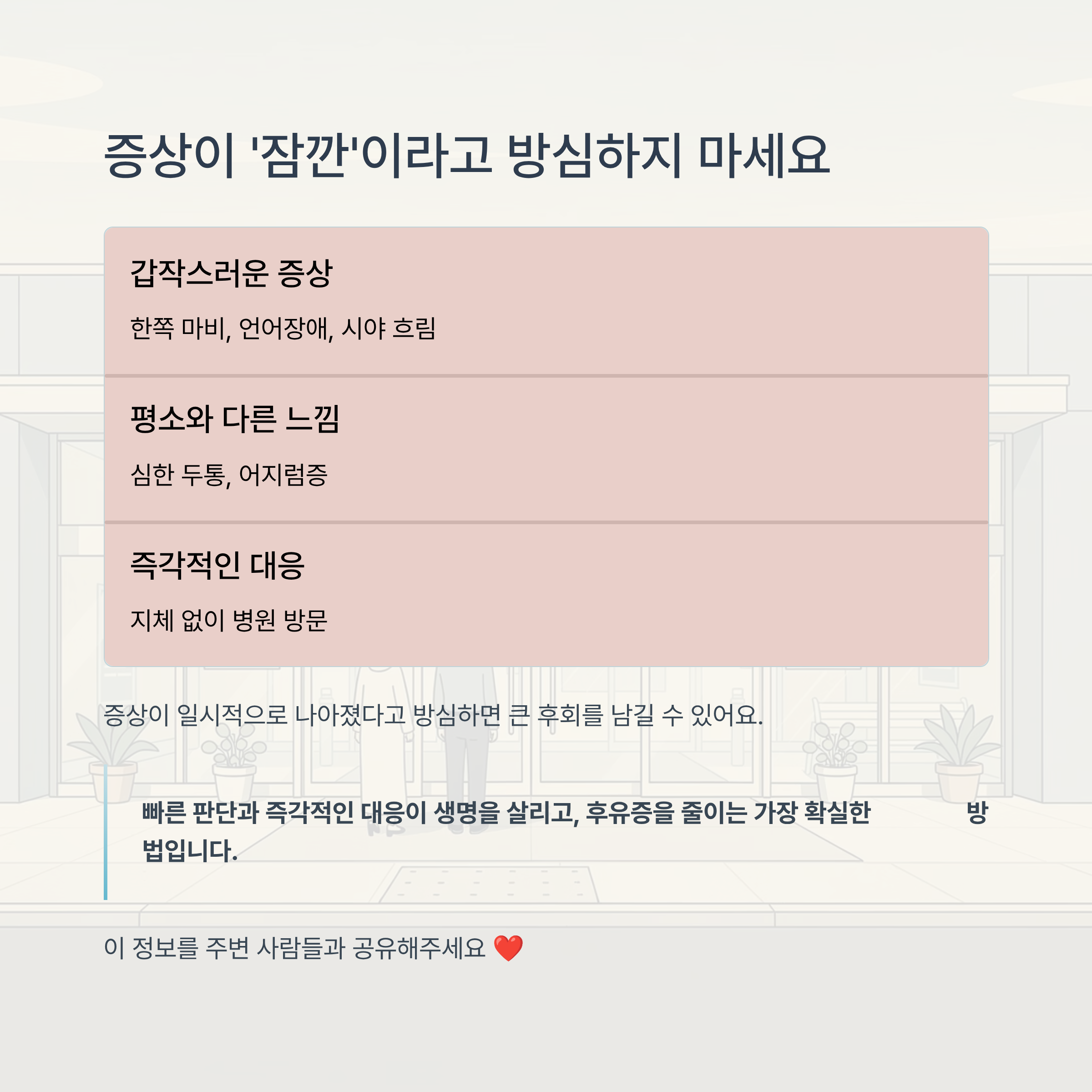 특히 증상이 일시적으로 나아졌다고 방심하면 큰 후회를 남길 수 있어요. 빠른 판단과 즉각적인 대응이 생명을 살리고, 후유증을 줄이는 가장 확실한 방법입니다.