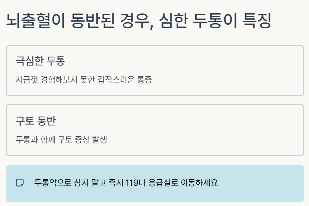 지금껏 경험해보지 못한 갑작스럽고 극심한 두통이 발생하며 구토까지 동반된다면, 뇌출혈을 포함한 뇌졸중 가능성을 반드시 고려해야 합니다.