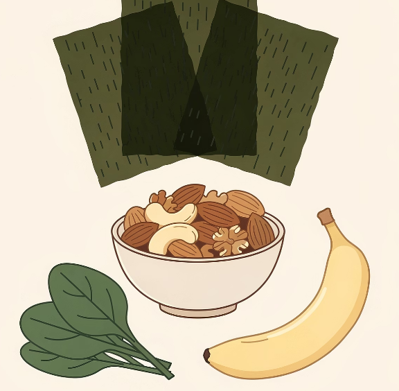 견과류, 시금치, 바나나, 해조류 등 마그네슘이 풍부한 식품을 꾸준히 섭취해 보세요.