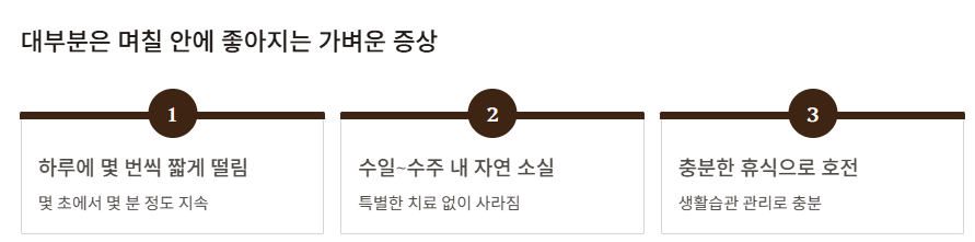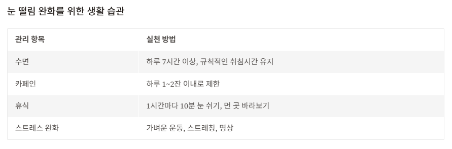 눈꺼풀 떨림은 흔히 피로, 수면 부족, 스트레스 등 일상적인 원인으로 생기는 경우가 많습니다.