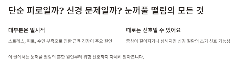 면 부족으로 눈 근육과 신경이 예민해지면서 생기는 경우가 많지만, 증상이 길어지거나 심해지면 반드시 병원을 찾아야 합니다. 이 글에서는 눈꺼풀 떨림의 흔한 원인부터 위험 신호까지 정리해 드립니다.